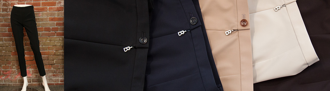Women’s flat front, side zip, ankle pant (Susan is a true believer that if you show a little ankle, you’ll look taller and thinner.) Sizes 4 – 18, in brown, ecru, taupe, navy and black. They look equally good with flats and heels. Washable! You won’t be paying your dry cleaner for this wardrobe staple. They are perfect for all you traveling ladies – they do not wrinkle! You’ll look as great disembarking from a ten hour flight as you did when you boarded.